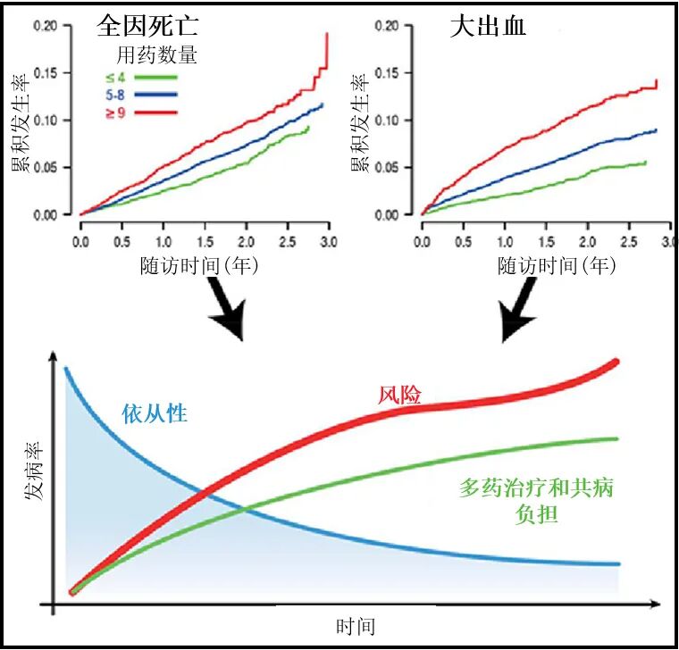 多药治疗和不依从是增加心血管事件和出血事件的风险指标(图2)。