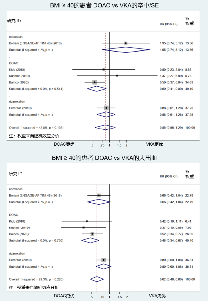 与正常体重患者相比,无论抗凝剂类型如何,肥胖患者卒中/SE风险都较低(RR: 0.62; 95%CI: 0.57-0.69; 低确定性证据)。大出血风险无显著差异(RR: 1.00; 95%CI: 0.76-1.31; 极低确定性证据)。