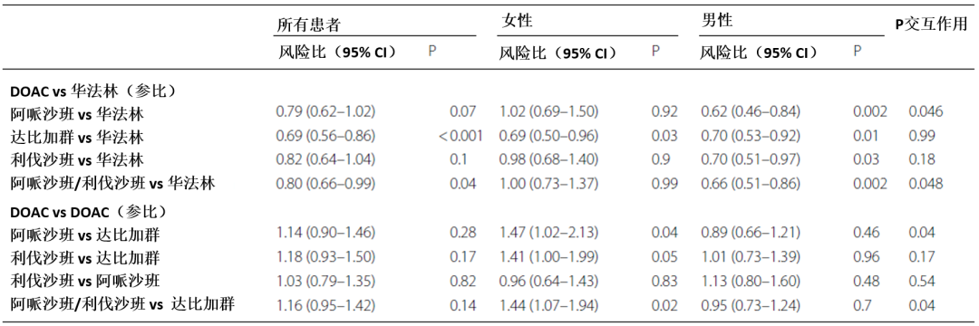 在DOAC之间的头对头比较中,与使用达比加群相比,使用阿哌沙班(HR, 1.14 [95%CI 0.90–1.46])和利伐沙班(HR, 1.18 [95%CI 0.93–1.50])患者的糖尿病风险更高,但无统计学意义。在比较利伐沙班与阿哌沙班的患者情况时,未观察到与糖尿病风险降低的显著相关性。在女性DOAC使用者中,达比加群的糖尿病风险也显著低于华法林、阿哌沙班和利伐沙班。
