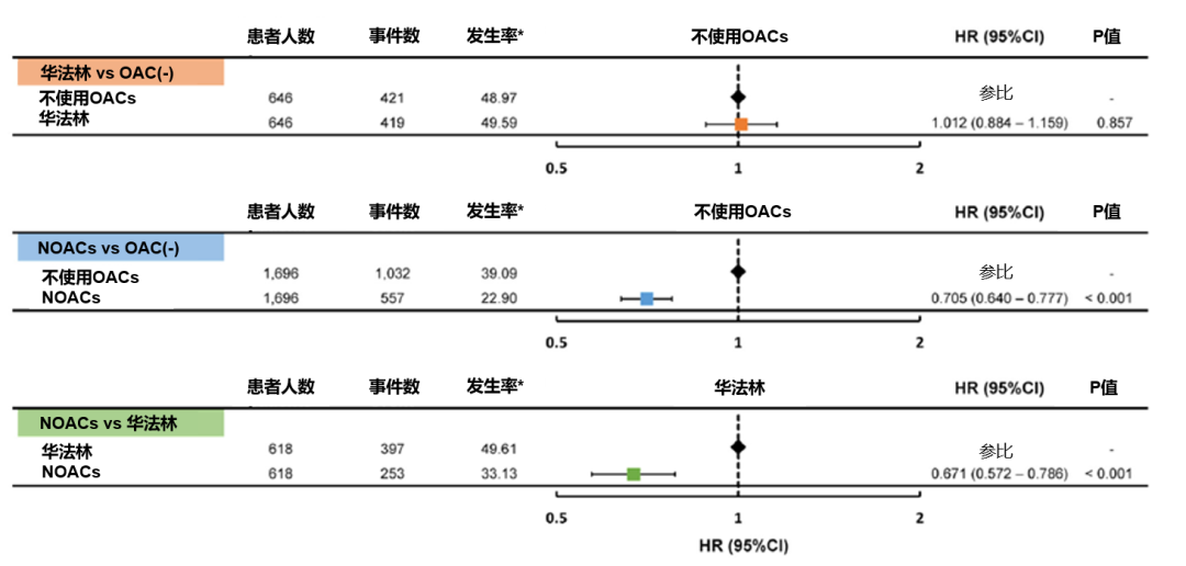 研究的主要终点是缺血性卒中、ICH、大出血和死亡率的复合净临床结局。对患者进行了3种比较的倾向性评分匹配分析:华法林 vs 无OAC;NOAC vs 无OAC;NOAC vs 华法林。