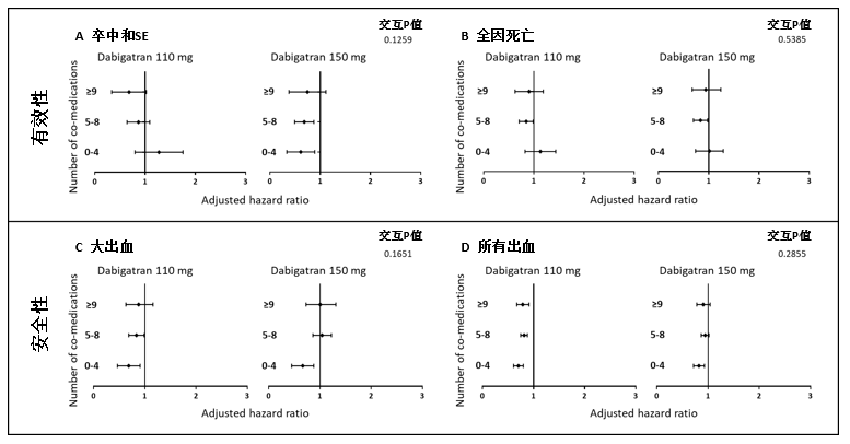 根据达比加群110mg和150mg对不同合并用药组分层结果显示,达比加群优于或等于华法林,两组之间的相互作用没有显著差异(SSE的交互P值 =0.126,全因死亡的交互P值=0.539,所有出血的交互P值=0.286)(图1)。